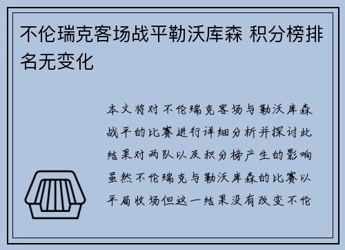 本文将对不伦瑞克客场与勒沃库森战平的比赛...