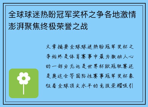 文章摘要:全球球迷热盼冠军奖杯之争,始终...