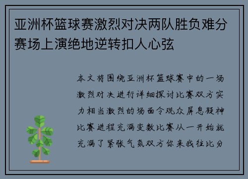 本文将围绕亚洲杯篮球赛中的一场激烈对决进...